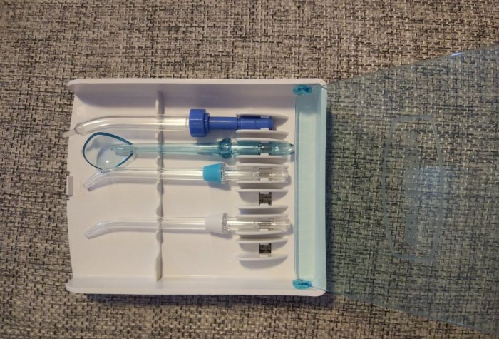 Набор насадок, запакован в отдельный герметичный пакет, в нем 3 шт для обычных полосканий, ложечка-скребок для языка, насадка для брэкетов-десен. Думаю реально же, использоваться будет только обычные.
