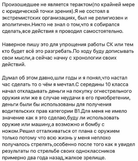 Ранее в своем манифесте Тимур Бекмансуров писал, что еще не решил "закончить все самому, или предоставить сотрудникам полиции". Он подробно описал, как получил лицензию, купил оружие и спланировал нападение. По его словам, изначально он собирался устроить атаку на свою бывшую школу, но все же выбрал университет из-за большого количество корпусов и людей.