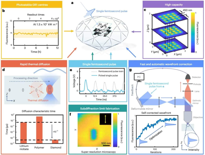 Концептуальная схема алмазного носителя информации. Данные хранятся в алмазе с помощью фемтосекундных лазерных импульсов (a). Флуоресценция остается стабильной при непрерывном лазерном облучении на длине волны 532 нм с плотностью мощности 1,3 × 10⁷ кВт м-², необходимой для кодирования в оттенках серого (b). Конфокальное изображение, демонстрирующее уложенную схему хранения (c). Алмаз, обладающий высокой теплопроводностью, быстро рассеивает тепло, обеспечивая точность записи (d). Фемтосекундные импульсы создают электрический сигнал длительностью 4 нс, ограниченный полосой пропускания фотодиода (e). Изображение с суперразрешением запоминающего устройства, которое выглядит как тонкая резкая полоса с полувысотой шириной 69 нм и 160 нм, соответственно (f). Система записи автоматически корректирует волновой фронт для оптимизации фокусировки лазера, компенсируя разницу индексов на границе раздела масло-алмаз (g). Этот метод использует уникальные свойства алмаза для хранения данных высокого разрешения, точности и долговечности.