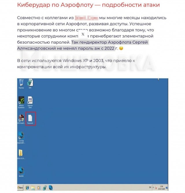 Пароль с 2022 года и Windows 2003? Что могло пойти не так... Хакеры заявили, что взломать «Аэрофлот» было проще, чем отменить рейс — и всё потому, что глава компании не менял пароль уже два года, а кое-где до сих пор использовалась легендарная Windows XP.