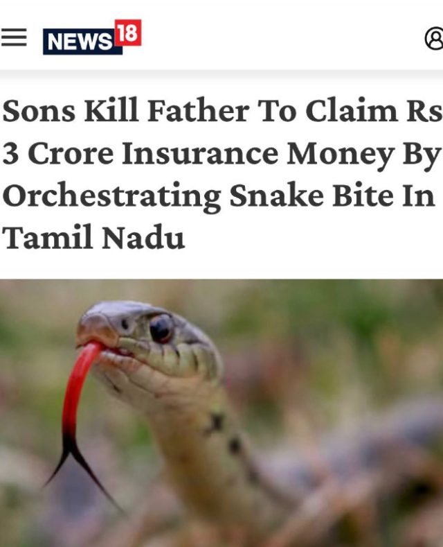В штате Тамилнад полиция задержала двух братьев и ещё четырёх человек. По версии следствия, они убили собственного отца, чтобы получить страховую выплату — около 30 млн рупий.