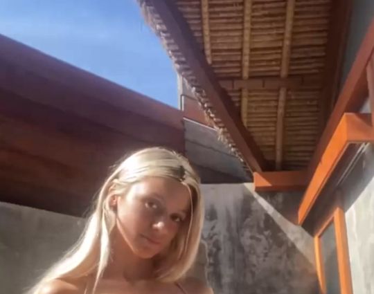 Закончив просто так валяться на кровати и решив действовать, голая куколка с сексуальной грудью уверенно встала в позу раком и, игриво повиляв выпяченной кверху упругой попкой, крупным планом.