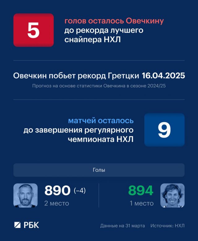 Ночью по московскому времени капитан «Вашингтона» Александр Овечкин отличился голом в матче с «Баффало Сейбрз» (5:8). Ему осталось всего 4 гола до рекорда НХЛ по количеству голов в регулярных чемпионатах. Для того чтобы побить рекорд, Овечкину нужно забить еще 4 шайбы, чтобы обойти Уэйна Гретцки (894 гола). Этот момент может наступить 5 или 16 апреля.