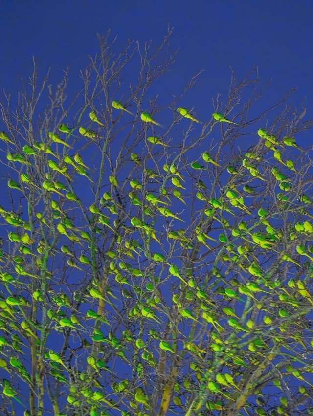 Оказывается дерефо было облеплено попугаями! Этот ярко-зеленый вид называется ожереловыми попугаями, и самое интересное, что все они не залетные гости, а настоящие жители Лондона — часто деревья зеленеют не листвой, а сотнями птиц.