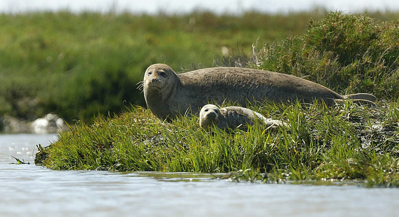 Взрослый тюлень присматривает за детенышем, который лежит на берегу залива Ньюарк в Национальном заповеднике дикой природы залива Сан-Франциско имени Дона Эдвардса во Фремонте, Калифорния. (Фото Aric Crabb / Staff / ZUMA Wire):