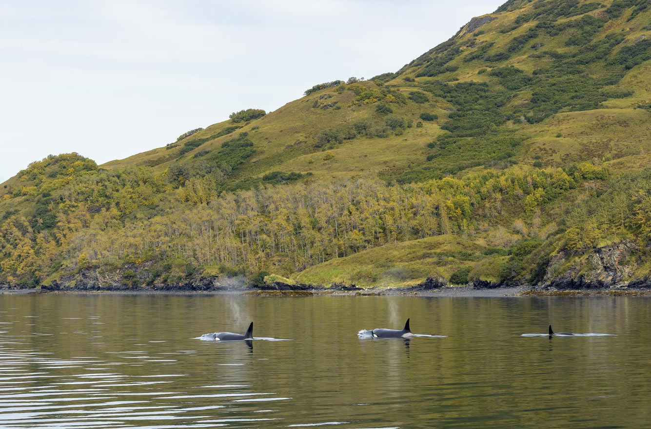 Стая косаток плывет по заливу Уганик в Национальном заповеднике дикой природы Кадьяк на Аляске. (Фотот Laura Hedien):