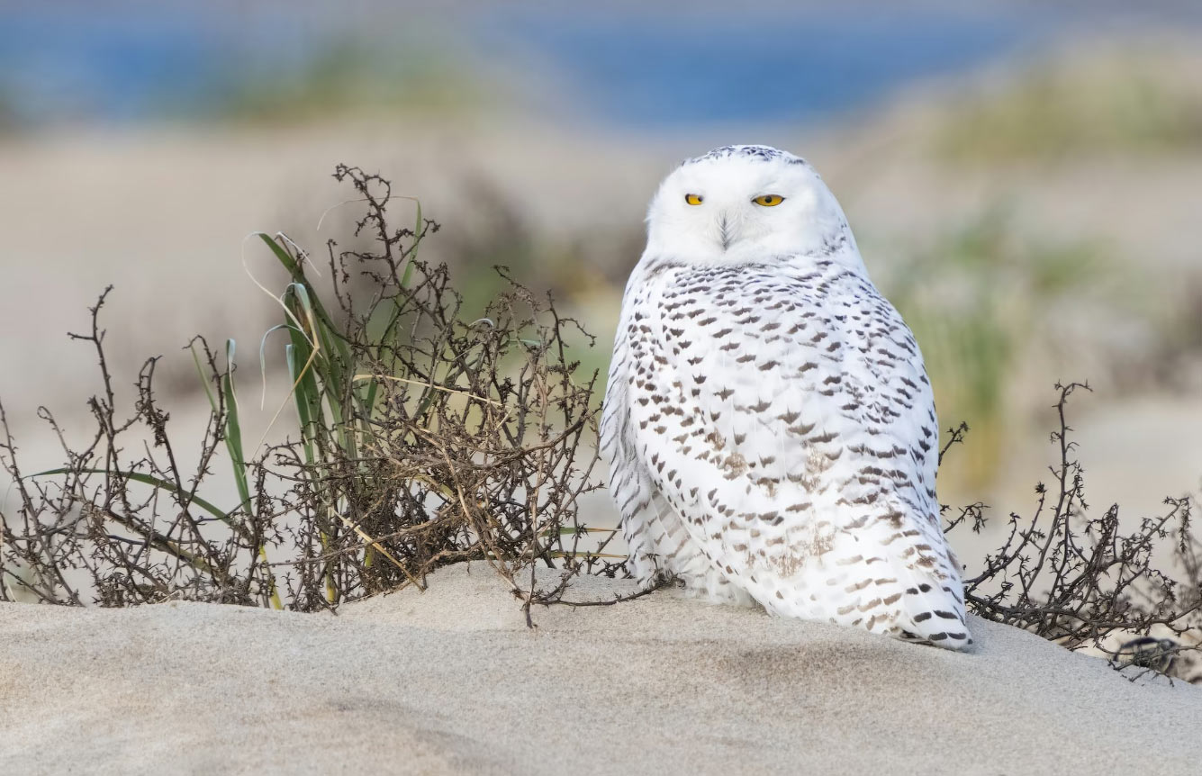 Полярная сова стоит на пляже в Национальном заповеднике дикой природы Паркер-Ривер на острове Плам в Массачусетсе. (Фото KenCanning):