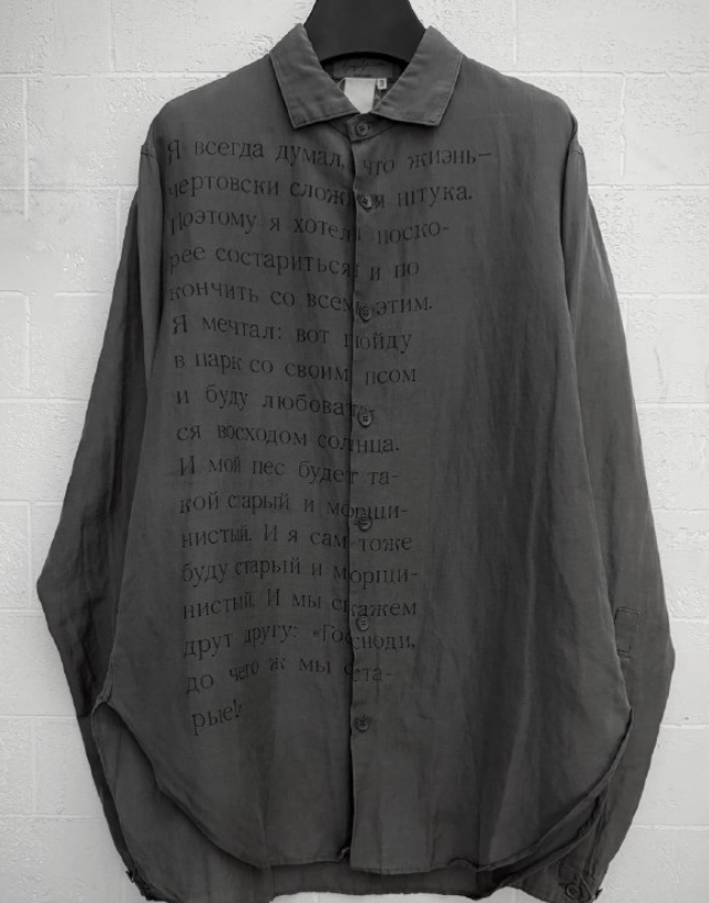 Винтажная рубашка Yohji Yamamoto из коллекции Spring/Summer 2000 с русским текстом — вещь с настроением и философией. Модно, странно и очень красиво.
