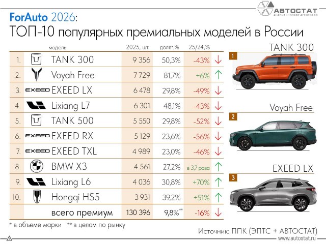 По итогам 2025 года рынок новых премиальных автомобилей в России просел на 16% и составил 130,4 тысячи машин. Несмотря на общее падение, лидер в модельном зачёте остался прежним — внедорожник Tank 300. За год его выбрали 9,4 тысячи покупателей.